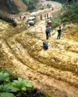 Today's start began at 8:00 for 9:30 start in a column of 4wd vehicles. The country seemed very peaceful and near the road it was dominated by rice paddies. We liked the groups of children making their way home from their "two-shift" schools. They were immaculate in their uniforms and we particularly liked the ones who were carefully carrying their shoes as they walked along the stony roads. These roads seemed fairly good at first, but as we approached our destination there was a fairly substantial river to ford. Ours, as the oldest and presumably the most expendable vehicle, was used as a trial. The fact I am writing this shows it succeeded and the other vehicles followed.