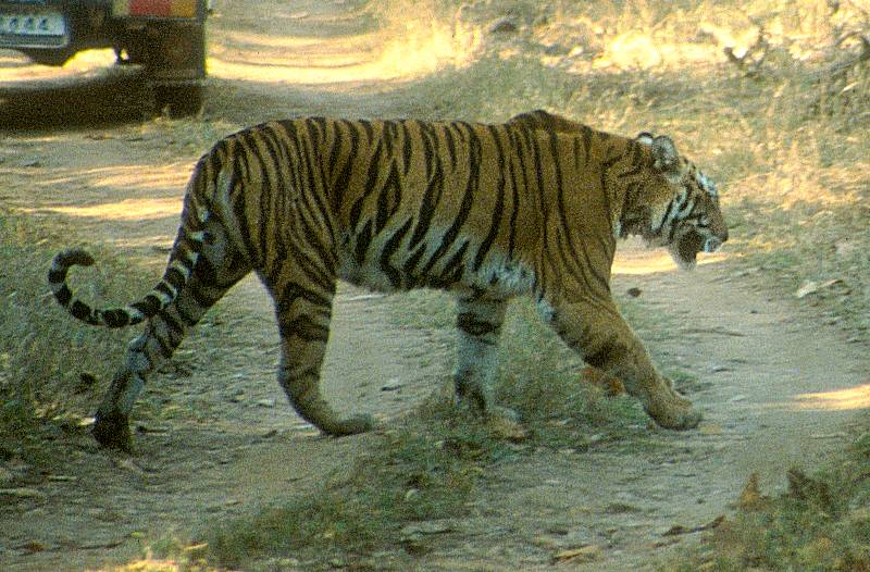 The tiger strode across the road