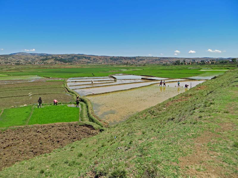 Replanting in progress Rice starts life closely-planted, like the green field on the left These small plants will be replanted with a bigger spacing