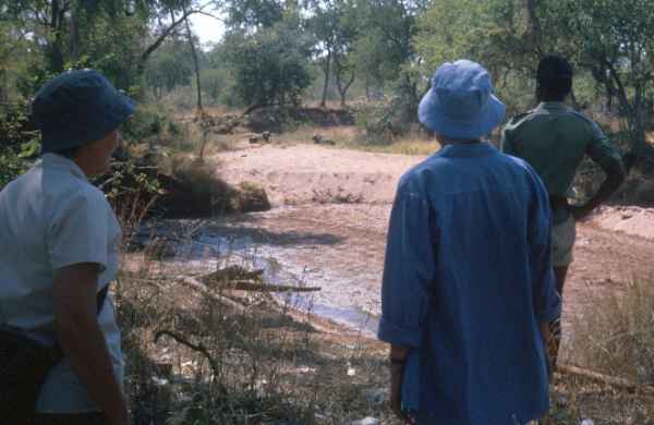 Cautiously watching a pair of elderly male buffalo, gun at ready.