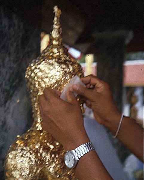 It seems that one buys gold leaf and then places it on a statue as an offering