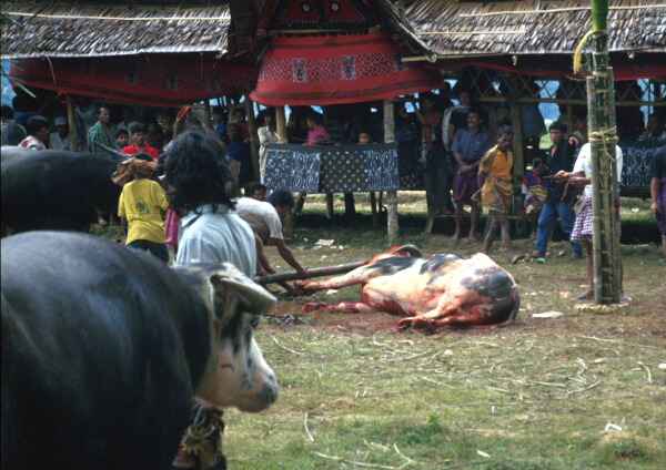 A water buffalo awaiting slaughter looks at the corpse of another buffalo.