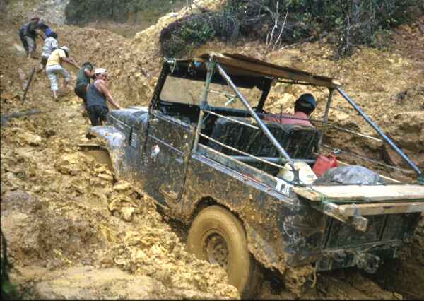 One of our vehicles struggling on the road from Gintu to Tentena