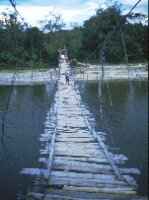 When we finally arrived, we started a walk to Torire and had to cross a substantial river by a brand new bridge. Nearby was the old one: a shabby suspension bridge constructed of lianas which had been in use until the new one was finished. I fancied crossing it and went with Pahrul, our young Indonesian guide, to do so. Unfortunately it was badly damaged and although the four lianas were intact, the floor was missing and many cross-links were broken. It was clearly not possible and we turned away. Then Pahrul suddenly rushed back and started to cross it on two of the lianas. He succeeded, although it looked pretty tricky. Feeling that this was a case where one had to fly the flag, I followed. It was difficult: it was very unstable and at times I had to hang in very tiring positions to stop the structure inverting. I was quite glad to reach the far side and puffing a bit! Later it was pointed out that I was twice his weight and had a rucksack on; ergo I am stupid.